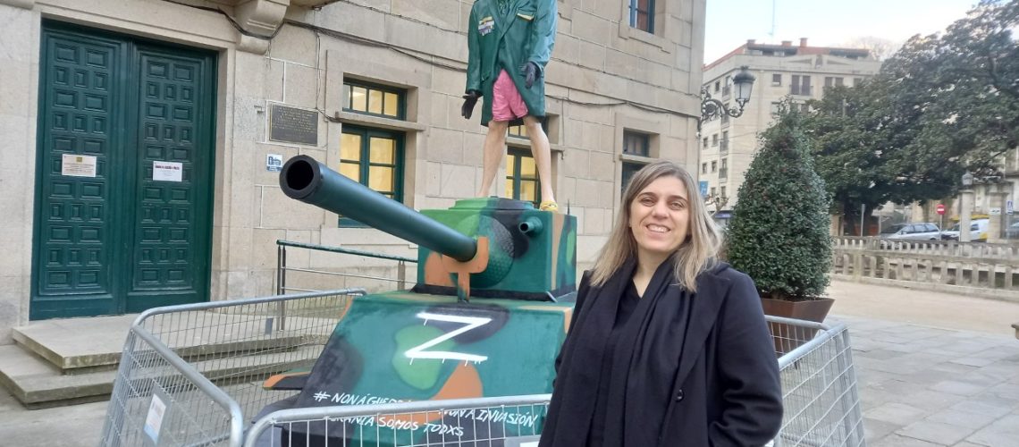 A figura, que xa se pode ver na praza do Concello representa ao presidente ruso subido nun carro de combate e quere ser un berro de “non a guerra”. Putin será así pasto das lapas na tradicional queima do meco que terá lugar o martes 21. Previamente a Concellería de Cultura ten organizado unha programación intensa con concertos de balde no Campo da Feira o sábado e o tradicional desfile de comparsas con centos de persoas das 15 comparsas participantes.