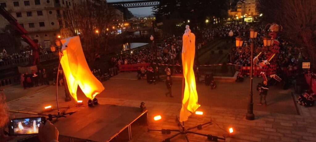 Unha performance artística a cargo de Pablo Méndez cun espectáculo aéreo de baile iniciaba o acto central da xornada e daba paso ao xa mítico berro de “Lume, lume, lume!” que prendía na figura do Meco, un Vladimir Putin que durante toda a semana anterior permaneceu as portas do concello. Unha figura que non foi indultada e que quedou reducida a cinzas tras un manifesto de Non a guerra: “ Soan as sereas, alertan á poboación, dun novo ataque da aviación no que só quedará destrución, morte e desolación. Putin quere guerra, ten moitas bombas na despensa, máis lle valería enchela de comida en vez de tanques que só deixan miseria. Lume á guerra – Lume aos tanques- Lume aos malos gobernantes – Lume, lume, lumeeee!”.
