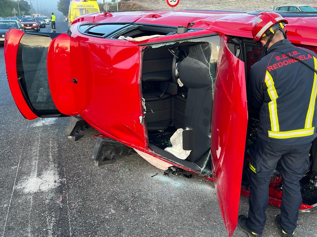 Aparatoso accidente o que tiña lugar na mañá de hoxe, ao redor das 8:30 horas na estrada entre Redondela e Vigo a altura de Plastic Omnium eb Cedeira. Por causas que se descoñecen un vehículo Audi RS Q3 conducido por unha moza envorcou chocando contra outros dous vehículos que se atopaban estacionados na beiravía.
