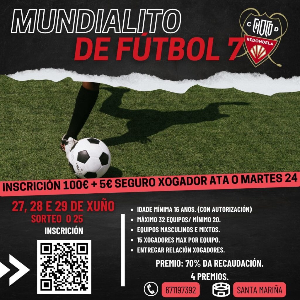 O Club Deportivo Choco anunciou a organización do primeiro Mundialito de Fútbol 7, un evento deportivo que se celebrará os días 27, 28 e 29 de xuño no Campo Municipal de Santa Mariña, prometendo converterse nunha das citas máis destacadas do verán para os amantes do fútbol na rexión. Segundo a información facilitada, a inscrición para participar neste torneo ten un custo de 100 € por equipo, aos que se suman 5 € de seguro por cada xogador. O sorteo dos emparellamentos está programado para o 25 de xuño, marcando o inicio oficial da competición.