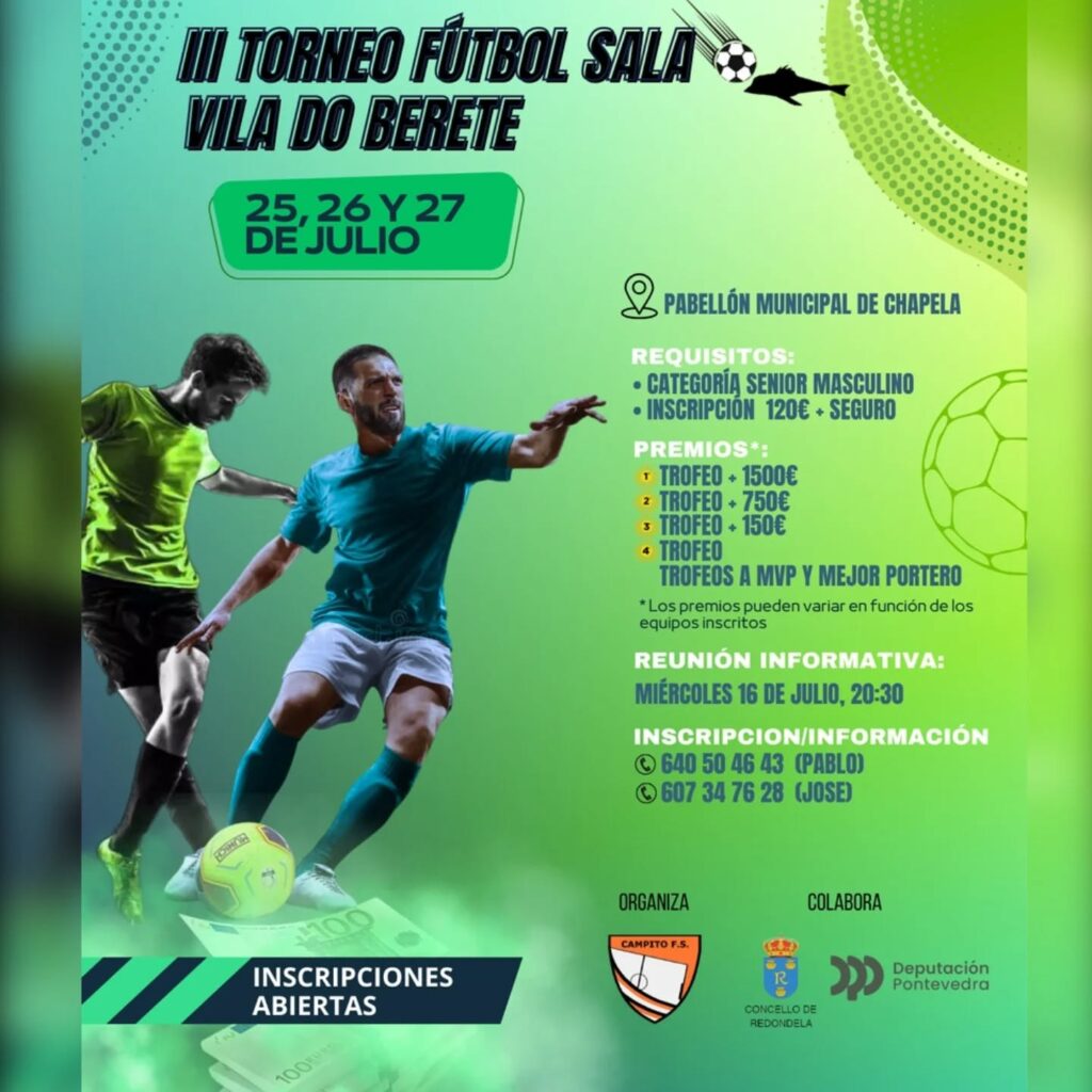 Con premio de ata 1.500 euros para o primeiro clasificado, o Torneo Vila do Berete que organiza o Campito Chapela celebrará a súa terceira edición os días 25, 26 e 27 de xullo con partidos no Pavillón Municipal Manuel González Soto. O prazo de inscrición para anotarse está aberto e este mércores 16 ás 20:30 horas celebran unha reunión informativa para todas as persoas interesadas.