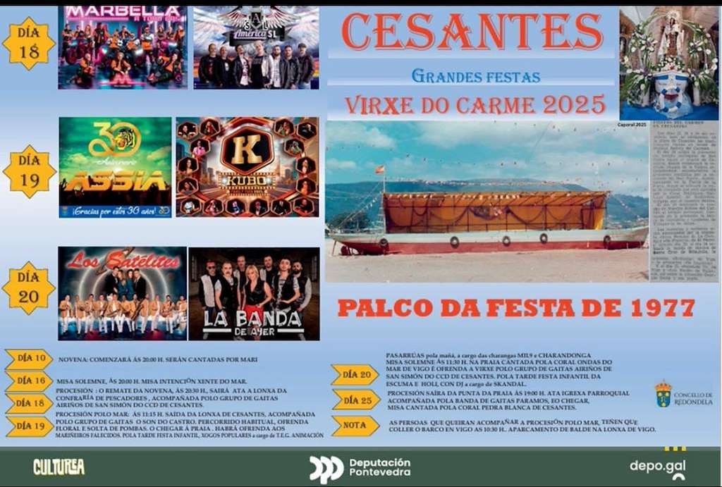 En total son seis agrupacións as que se subirán ao escenario dende este venres ata o domingo nunhas festas que se desenvolven na praia da Punta e nas que non faltará a tradicional procesión marítima prevista para o sábado, con participación de embarcacións que partirán dende o porto de Cesantes e tamén dende o Berbés en Vigo, dende onde sairán os barcos de maior tamaño ás dez da mañá.