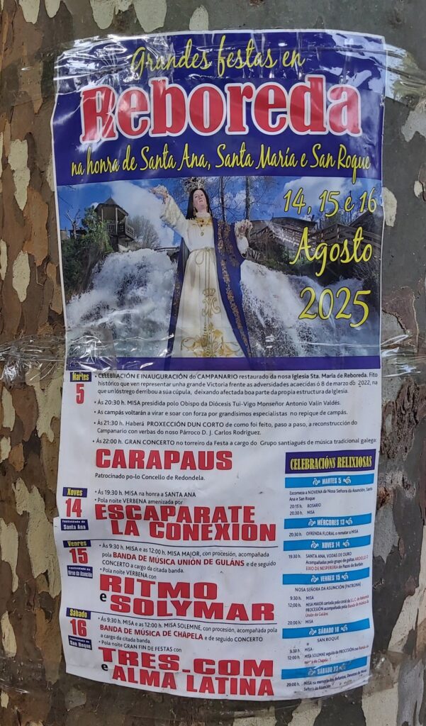 A parroquia de Reboreda celebra tres días de festa que neste edición chega precedida pola inauguración o pasado martes do recen restaurado campanario da Igrexa de Santa María de Reboreda. Unhas campás que volveron repenicar e que tamén o farán esta fin de semana para anunciar unhas festas que terán lugar os días 14, 15 e 16 de agosto.