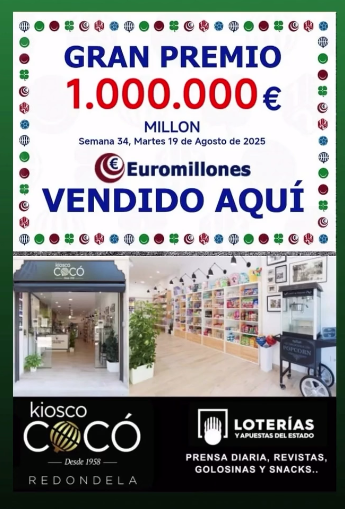 Este premio converte en millonario ao posuidor do boleto e, unha vez máis, a administración que o reparte é o kiosko Cocó quen xa ten repartido grandes premios en numerosas ocasións.