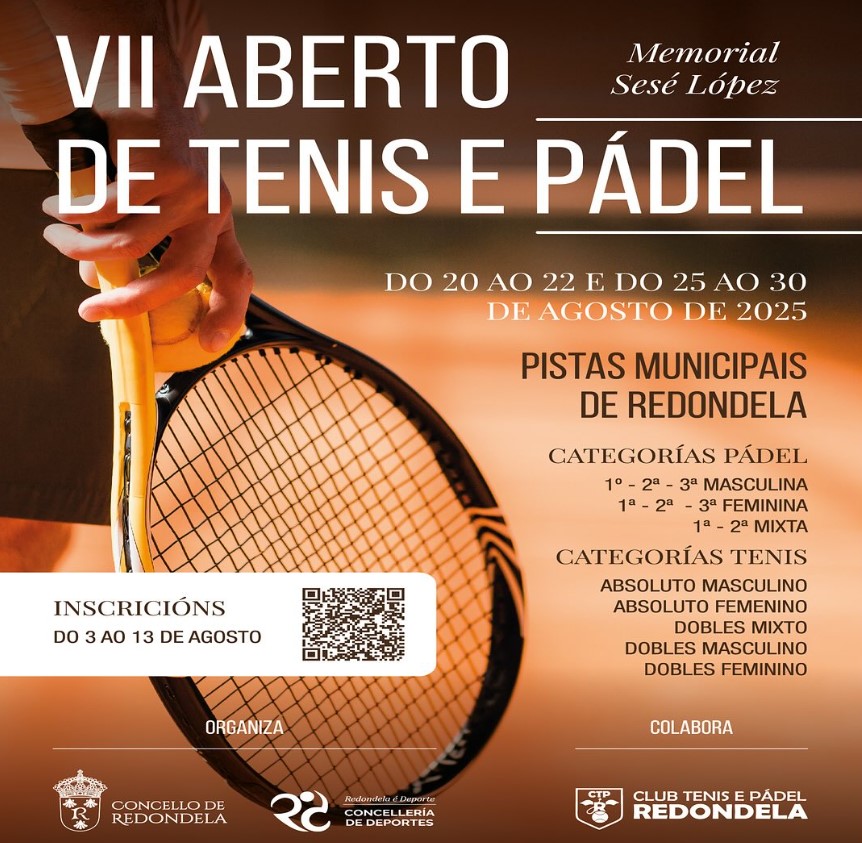 O VII Torneo Aberto de Tenis e Pádel, Memorial Sese López, organizado polo Club de Tenis e Pádel de Redondela en colaboración co Concello de Redondela e a Concellería de Deportes, está a ser un rotundo éxito nas Pistas Municipais da localidade. O evento, que arrancou o pasado 20 de agosto e se prolongará ata o sábado 30, destaca pola alta participación, superando en varias categorías o número mínimo de inscricións e xerando tal interese que algúns aspirantes quedaron fóra por limitacións horarias.