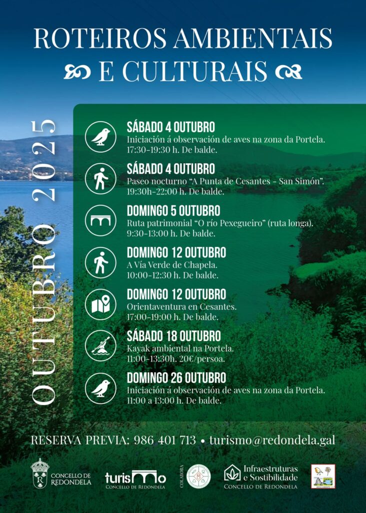 A oficina de turismo abre o prazo de inscricións nas diferentes actividades organizadas polas concellerías de Turismo e Sostibilidade para este mes de outubro. Un programa que arrancará este sábado con dúas citas: unha actividade de observación de aves na zona da Portela en horario de tarde de 17:30 a 19:30 horas. As sete e media haberá un paseo nocturno que se prolongará ata as dez da noite no praia da Punta en Cesantes.