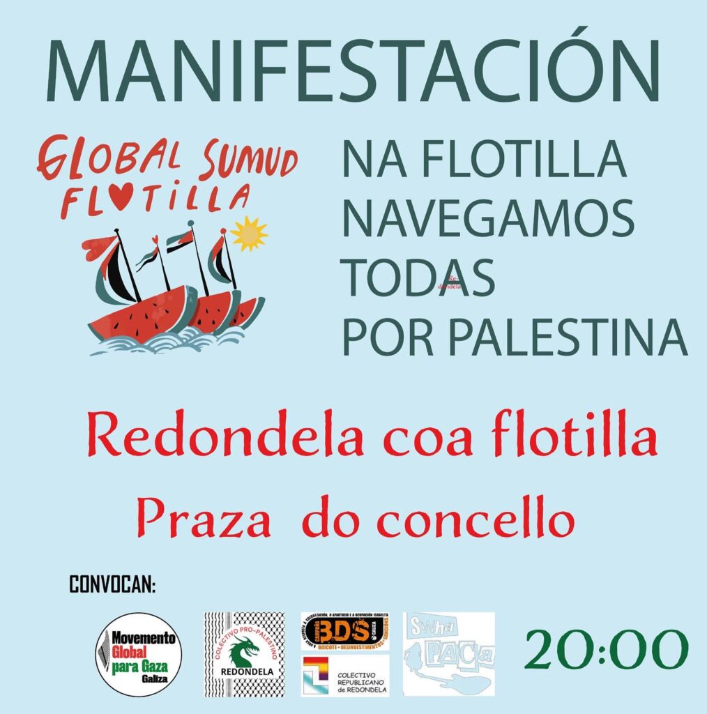 O ataque de Israel á Flotilla que leva axuda humanitaria a Gaza e a retención ilegal de activistas, entre elas a galega Sandra Garrido, constitúe unha vulneración grave do dereito internacional. Para denunciar esta situación vinte localidades de toda Galicia, entre elas Redondela, mobilízanse ás 20:00 horas de hoxe para reclamar a inmediata posta en liberdade das persoas detidas e esixir unha vez máis o respecto aos dereitos humanos, o levantamento do bloqueo a Gaza e a protección da misión solidaria.