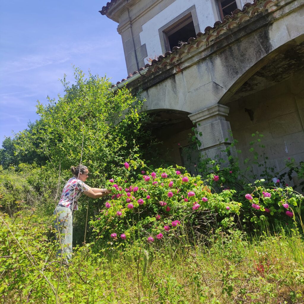 Nunha parcela de Cesantes, coida uns 300 rosais que forman parte da súa marca Lar do Aquel, especializada en tés artesanais. “Teño centos de rosais, pero non todos están na miña finca; algúns pasan por Silleda, onde fago os esqueixes, e cando están listos, veñen para aquí, a Cesantes. Agora é a época ideal para trasplantar. As variedades máis antigas son as máis aromáticas; por exemplo, o rosal de damasco, do que se extrae un aceite esencial carísimo, e teño ao redor de 50. Unha vez deshidratados, os pétalos aromatizan o té”, explica Fernández con entusiasmo.