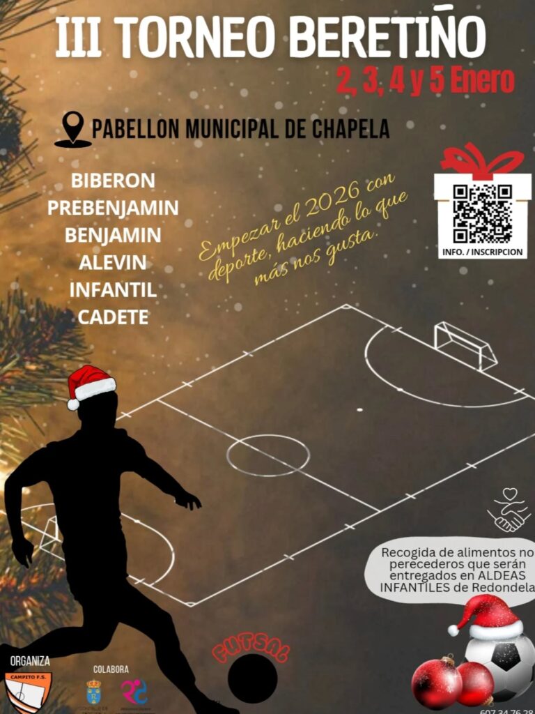 O Club Campito FS vén de abrir o prazo de inscrición para o seu III Torneo Beretiño, un evento deportivo dirixido ás categorías base que combina competición e diversión durante o Nadal. Celebrarase os días 2, 3, 4 e 5 de xaneiro, co obxectivo principal de axudar á conciliación familiar nas vacacións dos máis cativos.
