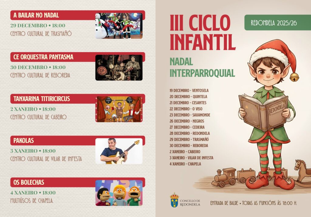 O programa, enmarcado dentro das actividades que o Concello organiza co gallo das datas do Nadal que arranca oficialmente este sábado co acendido das luces ás 20:00 horas, contará con trece espectáculos desde o 19 de decembro ata o 4 de xaneiro. Tanxarina, Os Bolechas, Pakolas, As Tareixas, Peter Punk ou Ce Orquestra Pantasma serán os encargados de achegar o teatro e a música en galego ao público infantil e familiar de todas as parroquias. Todas as actuacións serán ás 18.00 horas.