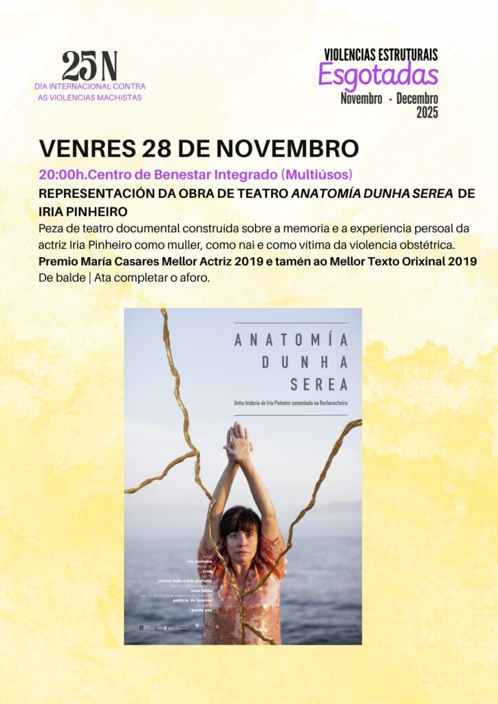 O Centro de Benestar Integrado de Soutomaior (Multiusos de Arcade) acolle, este venres 28 de novembro ás 20:00 horas dentro da programación do Concello de Soutomaior polo 25N – Día Internacional da Eliminación da Violencia contra as Mulleres- a alamada peza de teatro documental de Iria Pinheiro “Anatomía dunha serea”. Un espectáculo nacido do seu propio corpo e da súa memoria como muller, nai e vítima de violencia obstetricia que, desde o seu estrea, leva anos percorrendo escenarios, removendo conciencias e abrindo feridas que moitas mulleres recoñecen como propias. En 2019 conquistou os premios María Casares á Mellor Actriz e ao Mellor Texto Orixinal e segue hoxe tan vivo e necesario como o primeiro día.