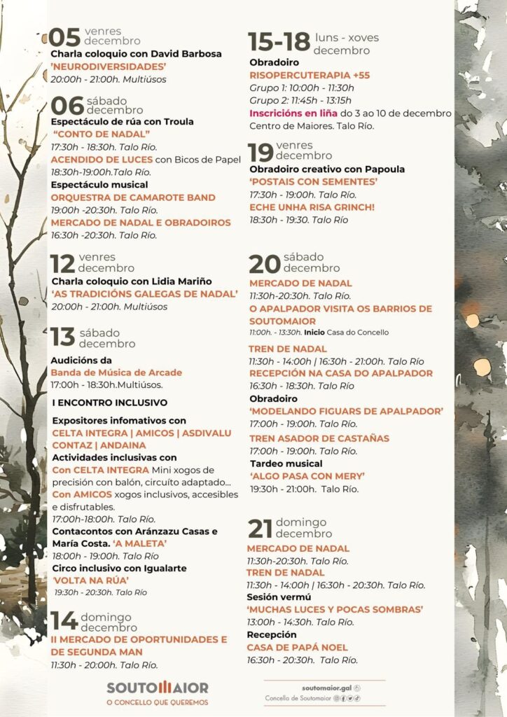 Baixo o lema “Vivir o Nadal en Soutomaior”, inclúese tamén no programa sorteos de vales de 100 euros entre a clientela que faga as súas compras no comercio e na hostalería local desde o 5 de decembro de 2025 ata o 7 de xaneiro de 2026, ambos incluídos) e se promoven tamén actividades deportivas como a carreira do San Silvestre que se desenvolverá o sábado 27 de decembro con inscricións abertas do 10 ao 21 de decembro.