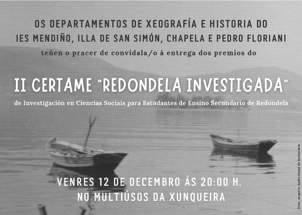 De feito, o Certame de Investigación en Ciencias Socias “Redondela Investigada” está organizado polos Departamentos de Xeografía e Historia dos IES de Chapela, Illa de San Simón, Mendiño e Pedro Floriani.