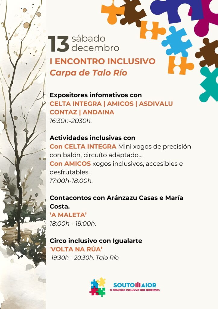 O Concello de Soutomaior dá un paso cara á inclusión real coa celebración do primeiro Encontro Inclusivo, que terá lugar o vindeiro sábado 13 de decembro na Carpa de Nadal da Alameda de Talo Río. Trátase dunha xornada festiva e aberta a todo o público na que se busca visibilizar o traballo de entidades especializadas en diversidade funcional e, sobre todo, crear un espazo onde todas as persoas, independentemente das súas capacidades, poidan participar en pé de igualdade.