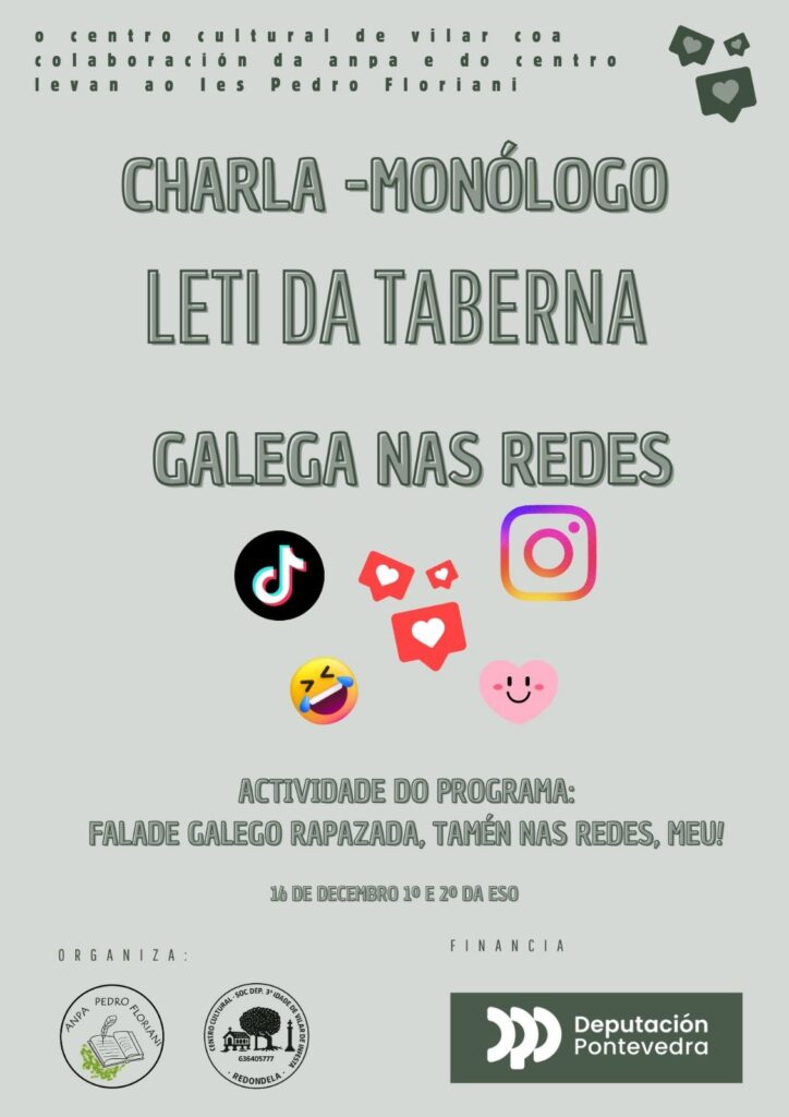 A actividade que se levará a cabo no IES Pedro Floriani será a charla-monólogo: “Galega nas Redes”, a cargo da monologuista e creadora de contido dixital Leti da Taberna. Trátase dun espectáculo formativo que terá lugar hoxe no IES Pedro Floriani. Con máis de 60.000 seguidores nas redes sociais, Leti da Taberna propón un monólogo charla sobre a creación de contido dixital en galego, incidindo na perspectiva no uso responsable das redes sociais.