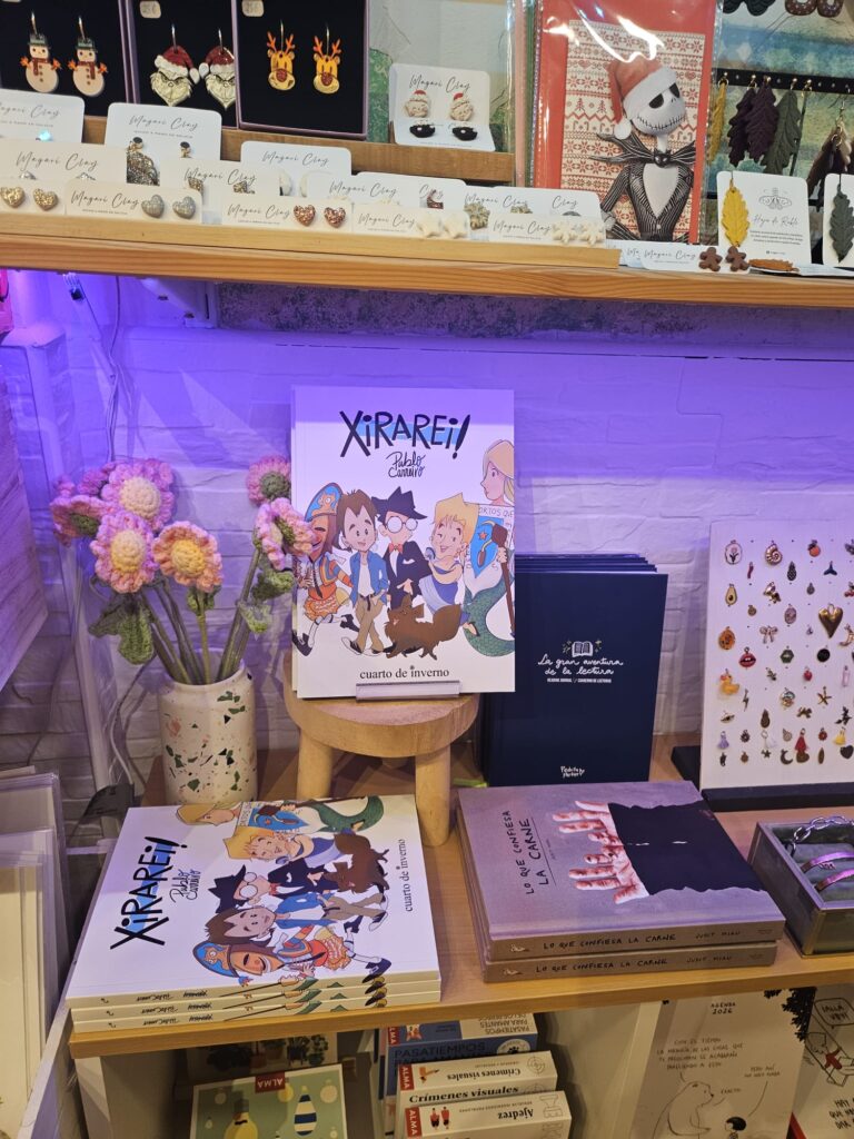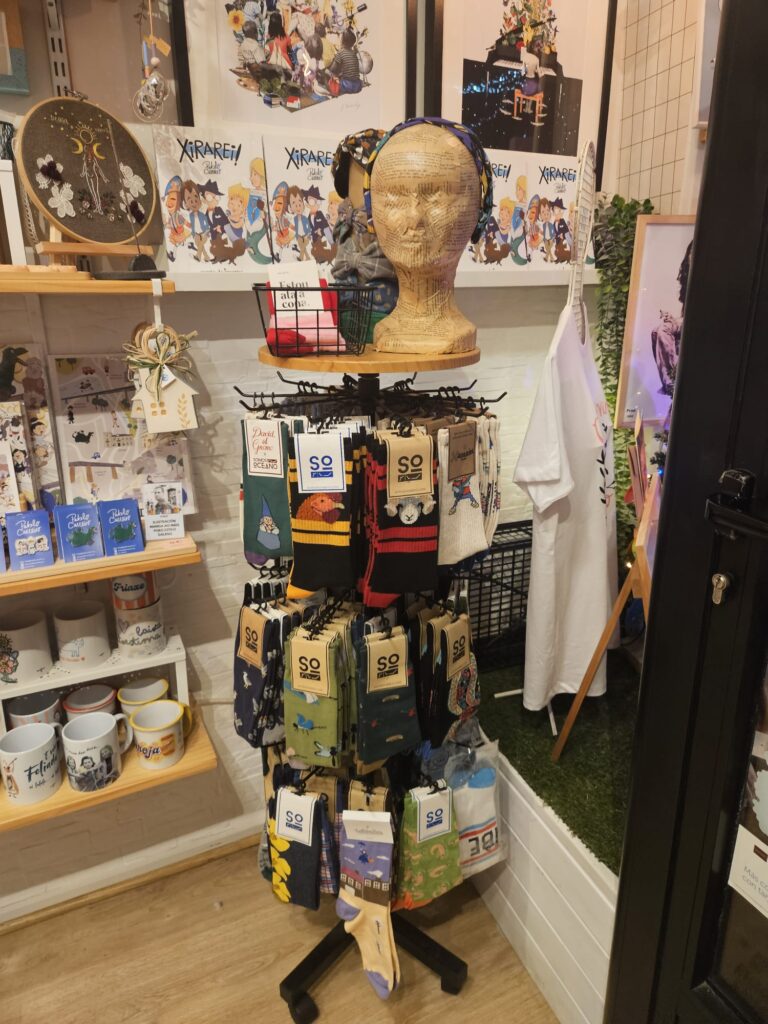 Diego subliña que moitos agasallos van en conxunto: “todo se complementa”. Por exemplo, unha xoia personalizada de Hati Musé pode ir acompañada dun gorro de Nuevemí e unha lámina de Alba Casanova, ou uns calcetíns do Xabarín Club con cerámica local. E lembra tamén os libros locais como o calendario histórico de Redondela ou o título Xirarei de Pablo Carreiro sobre a Festa da Coca, con pins temáticos que completan o paquete.