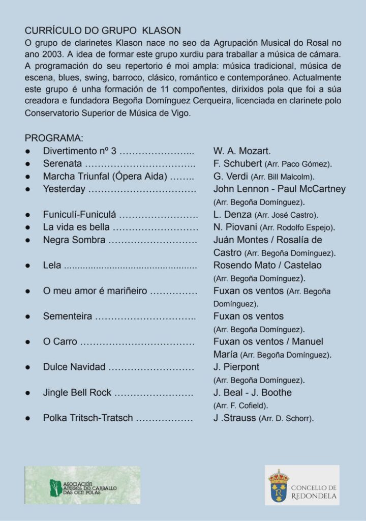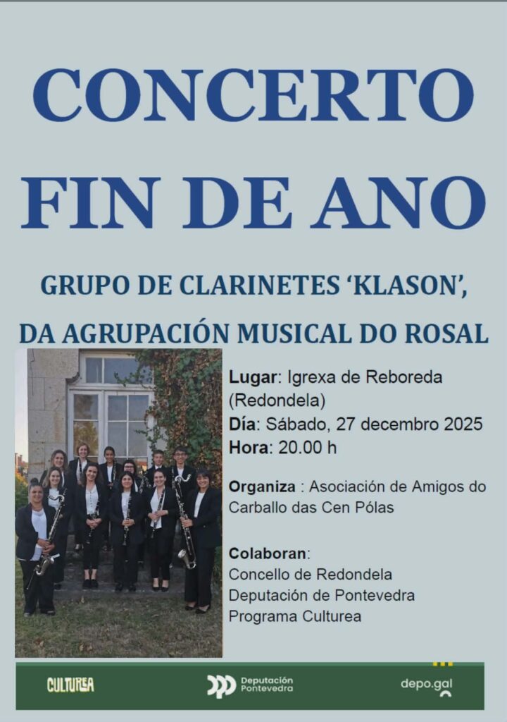 A Asociación de amigos do Carballo das Cen Pólas organiza este sábado ás 20:00 horas un concerto a cargo do grupo de clarinetes “Klason” da agrupación musical do Rosal. Unha cita musical cun repertorio cargado de música clásica pero tamén popular onde non faltará o Yesterday de The Beatles.