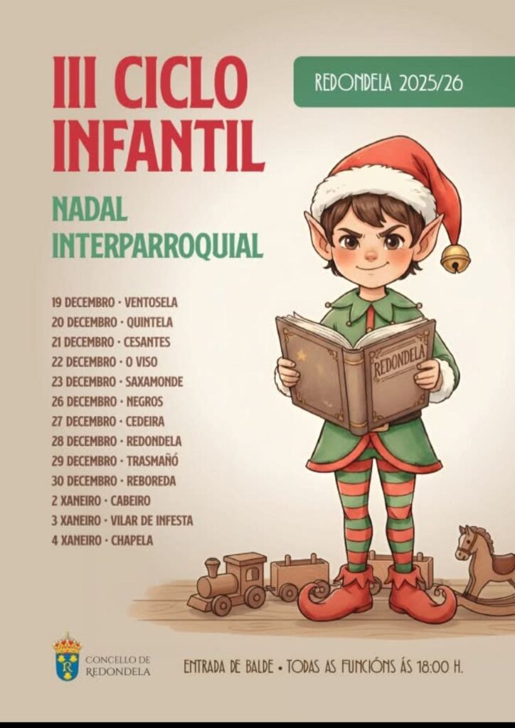 O III Ciclo Infantil de Nadal Interparroquial, que se estende ata o 4 de xaneiro de 2026, inclúe trece espectáculos gratuítos dirixidos ao público infantil e familiar, con compañías como Tanxarina, Os Bolechas, Pakolas ou Ce Orquestra Pantasma.