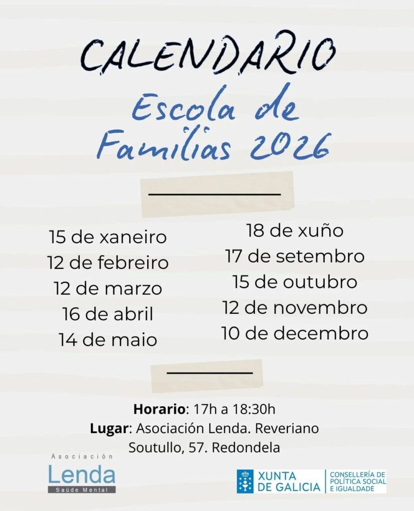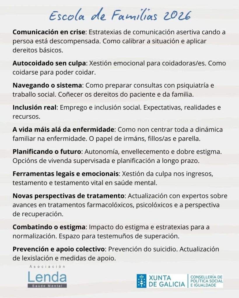 A Asociación Lenda Saúde Mental, entidade de referencia en saúde mental na área, presenta o calendario definitivo da Escola de Familias 2026, un programa mensual dirixido a familiares e persoas coidadoras de persoas con problemas de saúde mental. Trátase dun espazo de formación, apoio mutuo e autocoidado que, con case 25 anos de experiencia, recupera este ano un enfoque claramente psicoeducativo para dotar ás familias de ferramentas prácticas e realistas.