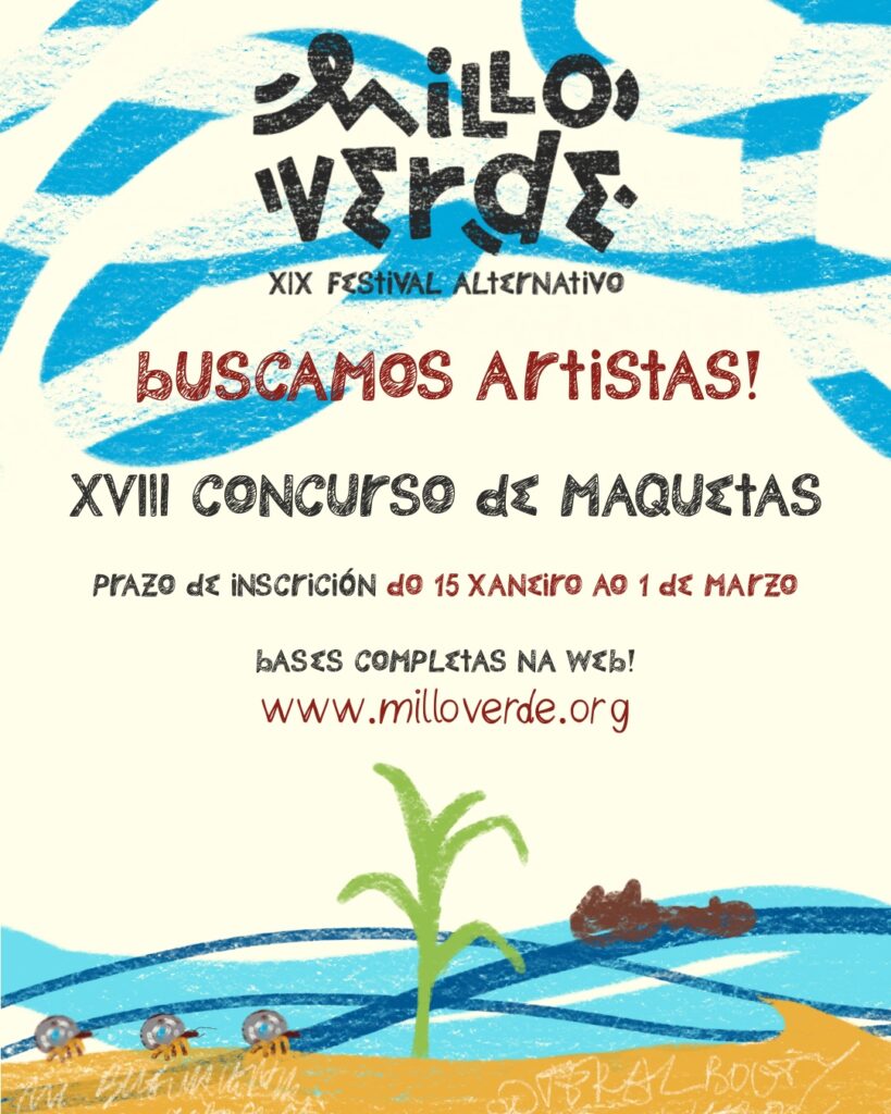 A Asociación Cultural terá aberto ata o 1 de marzo o prazo de inscrición para o XVIII Concurso de Maquetas Millo Verde. Os grupos ou artistas interesados en participar deberán remitir os seus traballos ao enderezo maketas@milloverde.org. O gañador do concurso farase cun premio de 500 euros e o dereito a formar parte do Festival que se celebrará os días 21, 22 e 23 de maio na praia de Cesantes.
