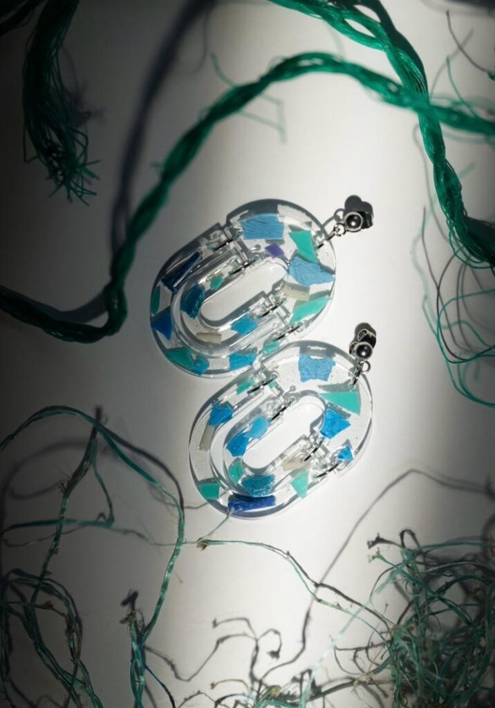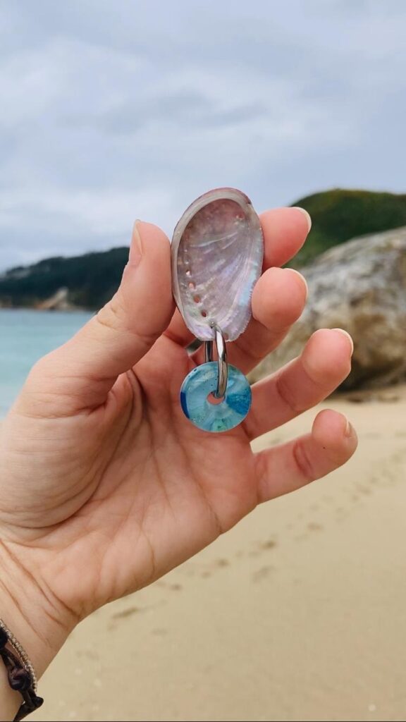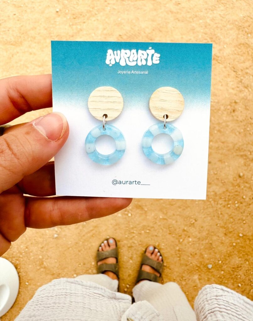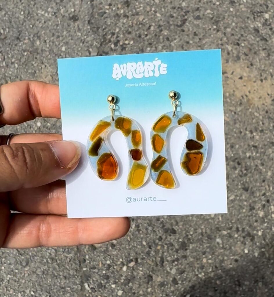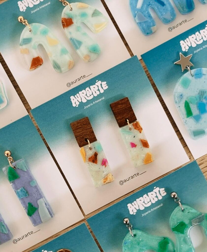 Claudia integra no seu proxecto unha especial sensibilidade cara a materiais marcados polo paso do tempo e pola acción do mar. Percorre praias de Galicia e Asturias recollendo plásticos, microplásticos, cabos, redes e vidros erosionados para facer xoias únicas. O proceso creativo de AURARTE é totalmente artesanal e sustentable, reflectindo un compromiso coa economía circular: “O primeiro que fago é facer limpeza nas costas. Logo, clasifico o material escollendo o que si que considero que se pode aproveitar, para logo manipulalo no taller. Os parto con alicates e tesoiras e todo fágoo a man, introducindo ese material reciclado en moldes ou cápsulas de resina derivadas da celulosa que é respectuosa co medio ambiente”. Esta resina, similar á usada en táboas de surf, garante durabilidade sen comprometer o planeta: “O que me interesa é que as pezas sexan únicas pero tamén que poidan durar moito“.