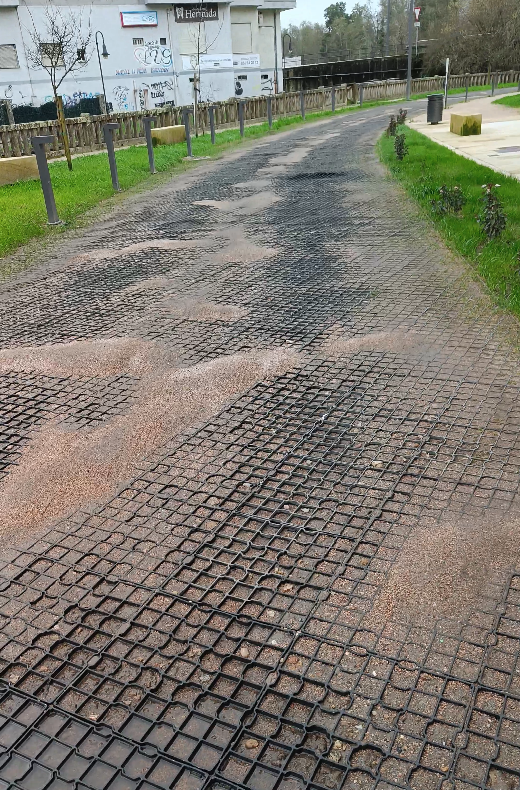 Explican que se colocou sobre a terra unhas planchas de plástico que favorecen que cando chove “se acumule a auga e se formen enormes charcos, chegando incluso a entrar auga pola baixada dos garaxes”. Non entenden a falta de previsión á hora de executar unha obra millonaria que non tivo en conta que este material non ía soportar o paso continuo de vehículos.