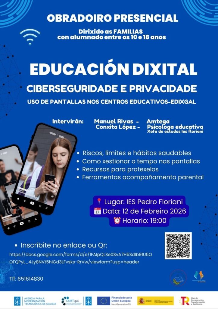 O EIS Pedro Floriani acolle este xoves ás 19:00 horas un obradoiro para familias sobre educación dixital, ciberseguridade e uso seguro das pantallas dirixido a familias con fillos e fillas de entre 10 e 18 anos de idade. No Obradoiro abordaranse cuestións de actualidade como a educación dixital, a ciberseguridade e a privacidade, así como o uso responsable das pantallas e a necesidade de establecer límites no tempo que os e as adolescentes pasan nas redes sociais. Inscrición neste enlace.