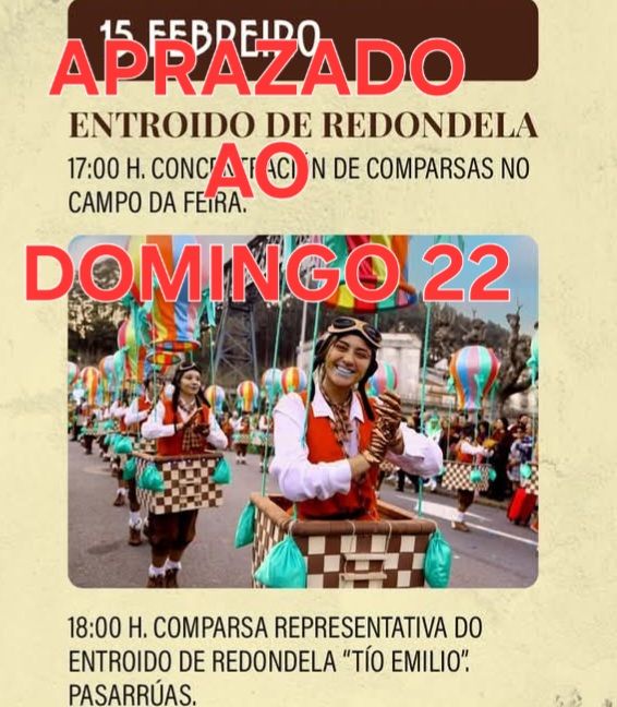 Cultura Redondela suspende o desfile de comparsas polo mal tempo Febreiro 13, 2026 Maria Xesús Queimaliños Non hai comentarios Ler nova
