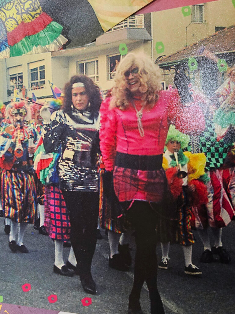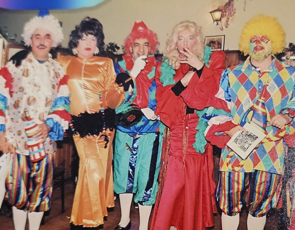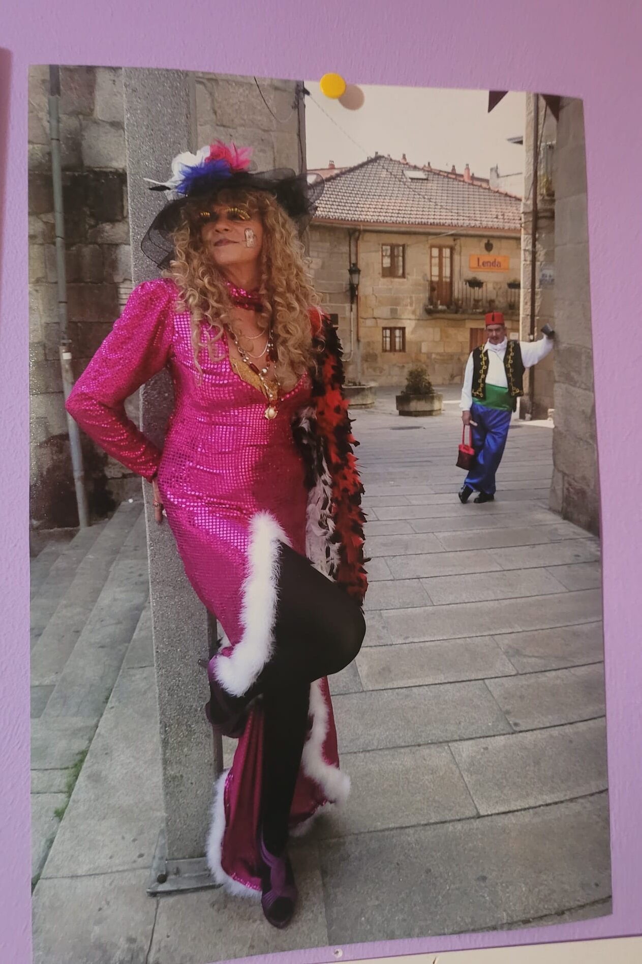 Un dos elementos máis característicos foi a presenza de homes vestidos de muller abrindo o desfile, idea de Xirelo (unha figura moi querida que tristemente faleceu novo) e Quique. “Non había mulleres na comparsa, así que nos vestimos nós e foi un éxito total”, recordan entre risos, destacando que “tiñan cantidade de mozos para eles” e que camiñaban con arte en tacóns altos como se fosen pasarelas.