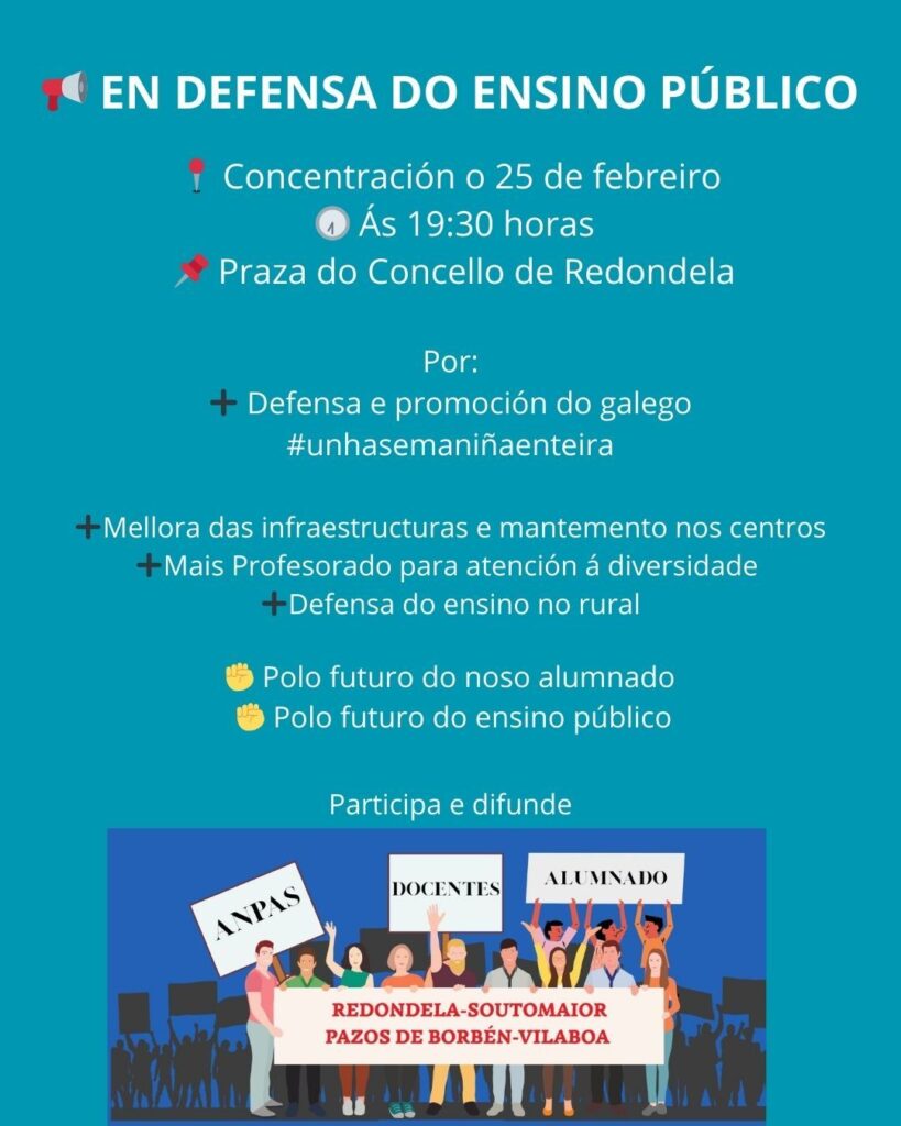 A Praza do Concello acolle este mércores 25 ás 19:30 horas unha concentración en defensa do ensino público á que están chamados a participar pais e nais, profesorado e alumnado. Unha protesta que se repetirá en seis localidades do sur da provincia e que reivindica a mellora das infraestruturas e o mantemento nos centros, máis profesorado para a atención á diversidade e defensa do ensino no rural.