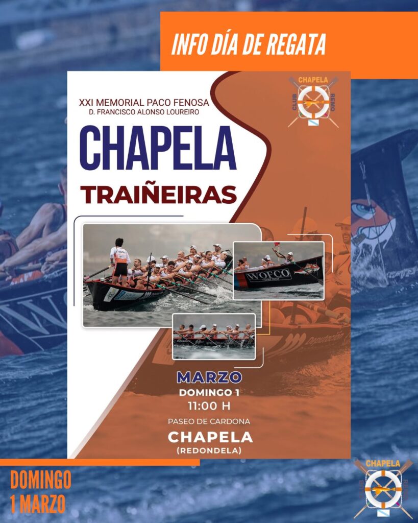 O Club de Remo Chapela organiza esta domingo 1 de marzo no Paseo de Cardona a XXI edición do Memorial Don Francisco Alonso Loureiro “Paco Fenosa”. A partid das 11:00 horas da mañá sairán ao mar embarcacións de toda Galicia nas categorías masculina, feminina, base e veteranos.