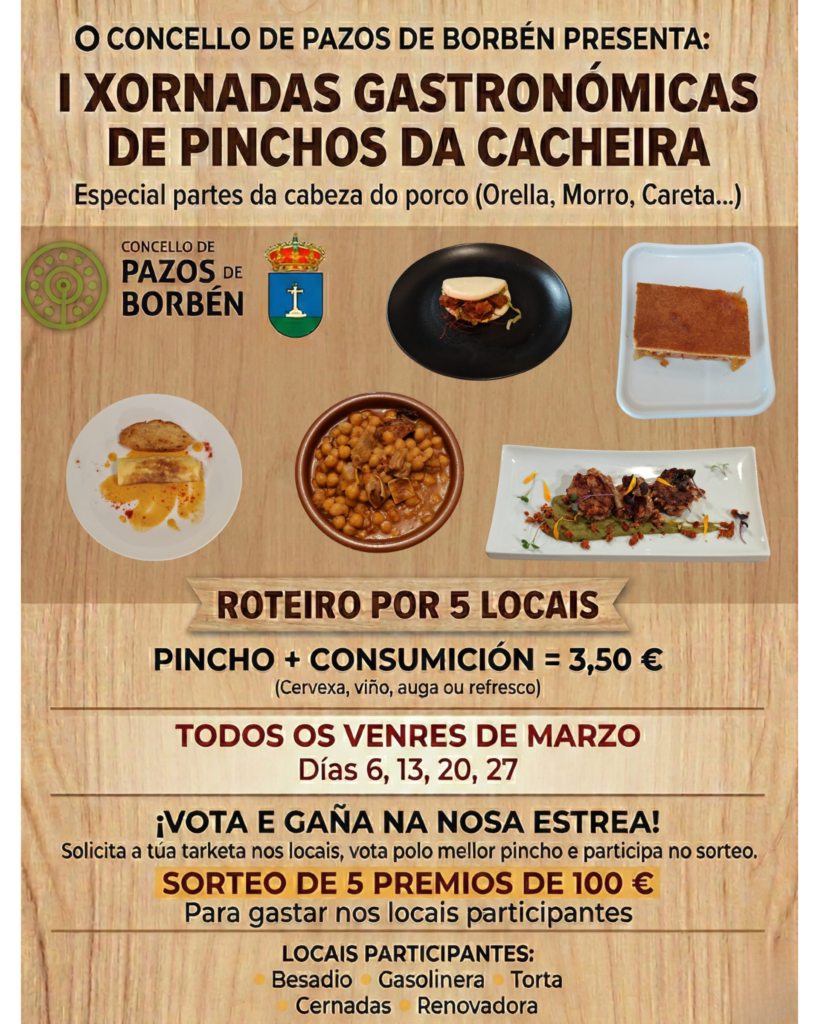 O Concello de Pazos de Borbén pon en marcha durante o mes de marzo as I Xornadas Gastronómicas de Pinchos da Cacheira, unha iniciativa que busca poñer en valor a gastronomía tradicional do municipio e dinamizar a hostalaría local a través dun roteiro culinario por diferentes establecementos.
