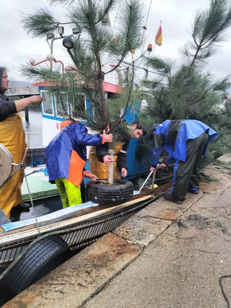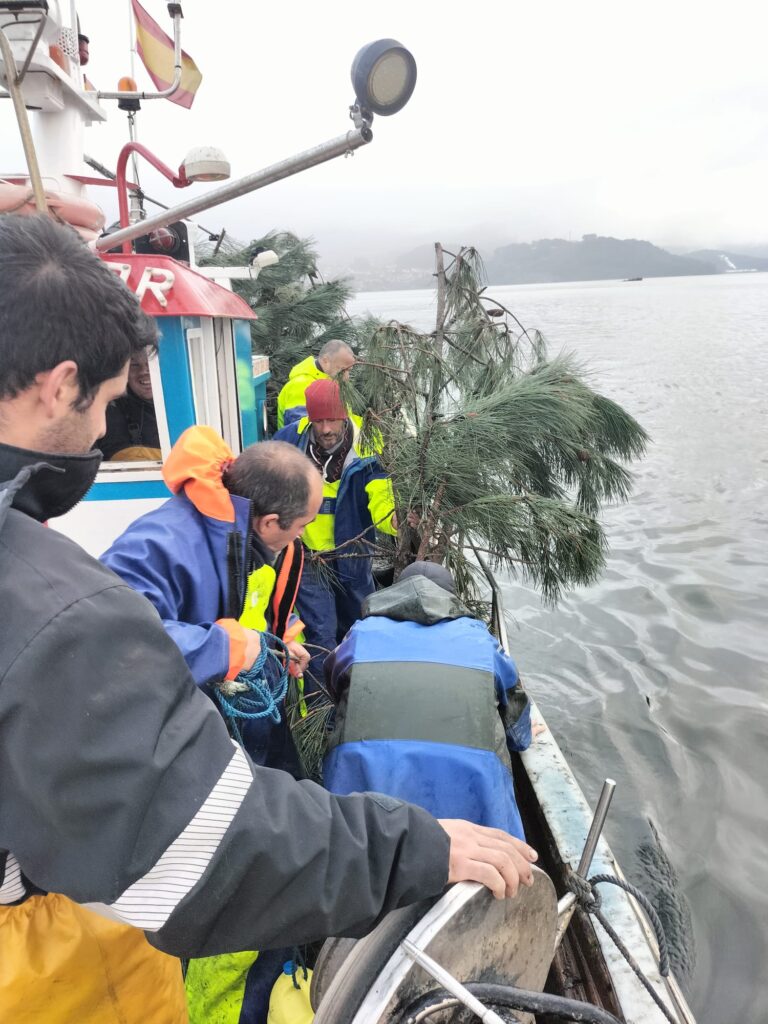 De feito, nos últimos días os mariñeiros traballaron intensamente para repoboar ese bosque mariño. Un proceso laborioso, xa que o primeiro paso é retirar os piñeiros do ano pasado recollendo as bases que se atopan mergulladas. A continuación hai que ir ao monte para a recollida de polas de piñeiros que son instaladas novamente nesas bases deseñadas especificamente para este fin. O último paso é cargar esas estruturas nos barcos e colocalas no fondo mariño.