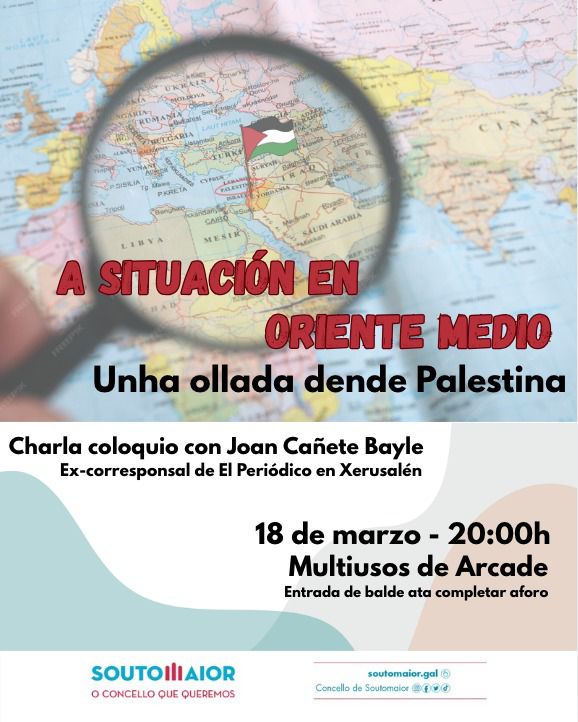 O Concello de Soutomaior organiza este mércores 18 de marzo ás 20:00 horas no Multiusos de Arcade unha charla con Joan Cañete Bayle, ex corresponsal de El periódico en Xerusalén. O xornalista compartirá a súa experiencia sobre a situación do pobo palestino nun acto aberto a toda a cidadanía.