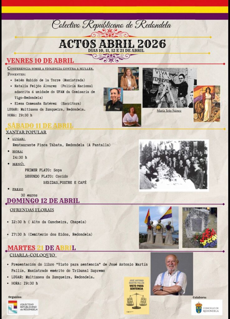 O sábado 11 de abril chega o xantar popular, un dos actos máis esperados pola súa dimensión social e festiva. O domingo 12 de abril celebraranse as tradicionais ofrendas florais. Ás 12:30 horas, no alto da Cuncheira, coa presenza de representantes do Ateneo Republicano de Vigo e da Asamblea Republicana de Vigo. Ás 17:30 h na fosa común do cemiterio dos Eidos e rematarán o acto na Praza da Segunda República, como é habitual.