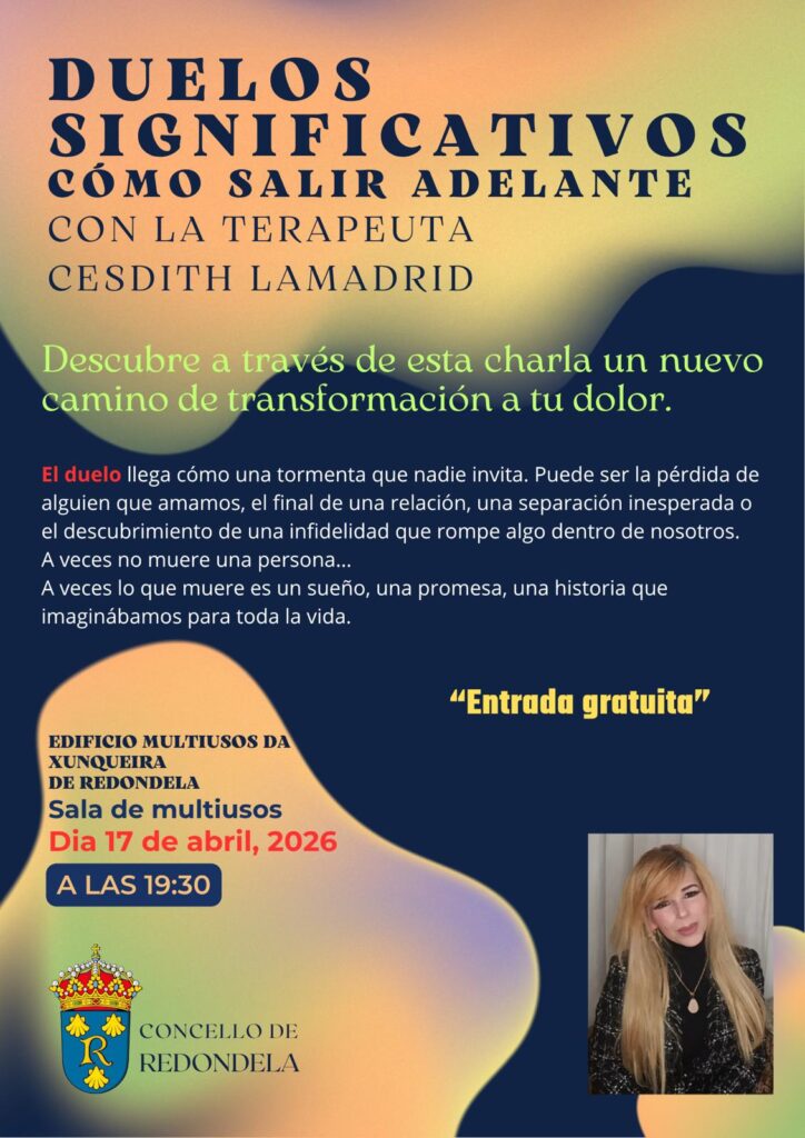 O Multiusos da Xunqueira acolle mañá venres 17 de abril, ás 19:30 horas a charla “Duelos Significativos: Como saír adiante”, impartida pola neuropsicóloga e terapeuta Cesdith LaMadrid. A entrada é libre e gratuíta.
