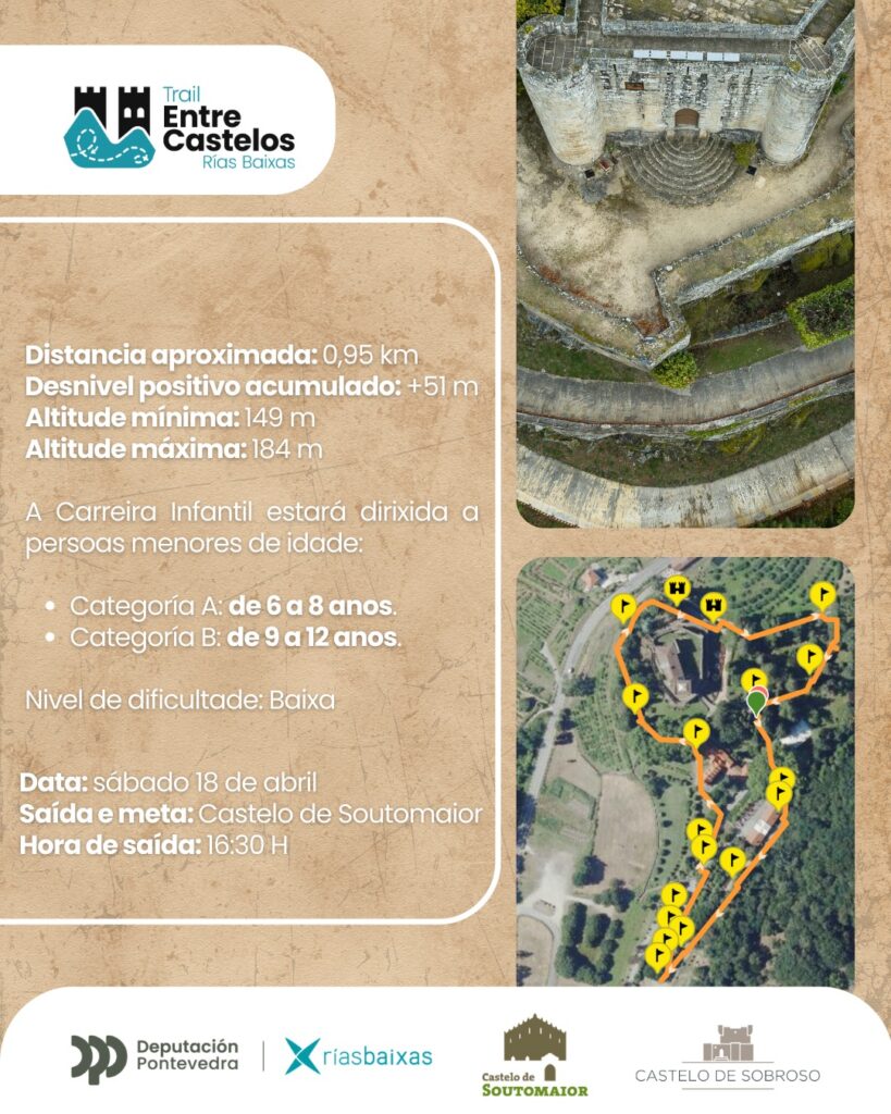 O trail “Entre Castelos Rías Baixas” é unha proposta única en España que conectará a través dunha carreira a pé de case 26 quilómetros as dúas fortificacións de titularidade provincial, o Castelo de Sobroso, en Mondariz, e o Castelo de Soutomaior. Unha proba deseñada para o desfrute en familia, que une deporte, patrimonio e promoción do territorio e ofertará unha fin de semana chea de actividades na provincia de Pontevedra.
