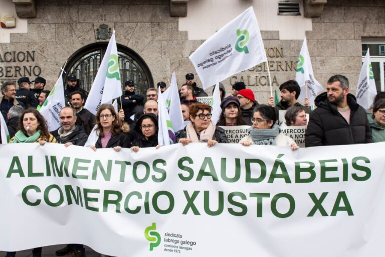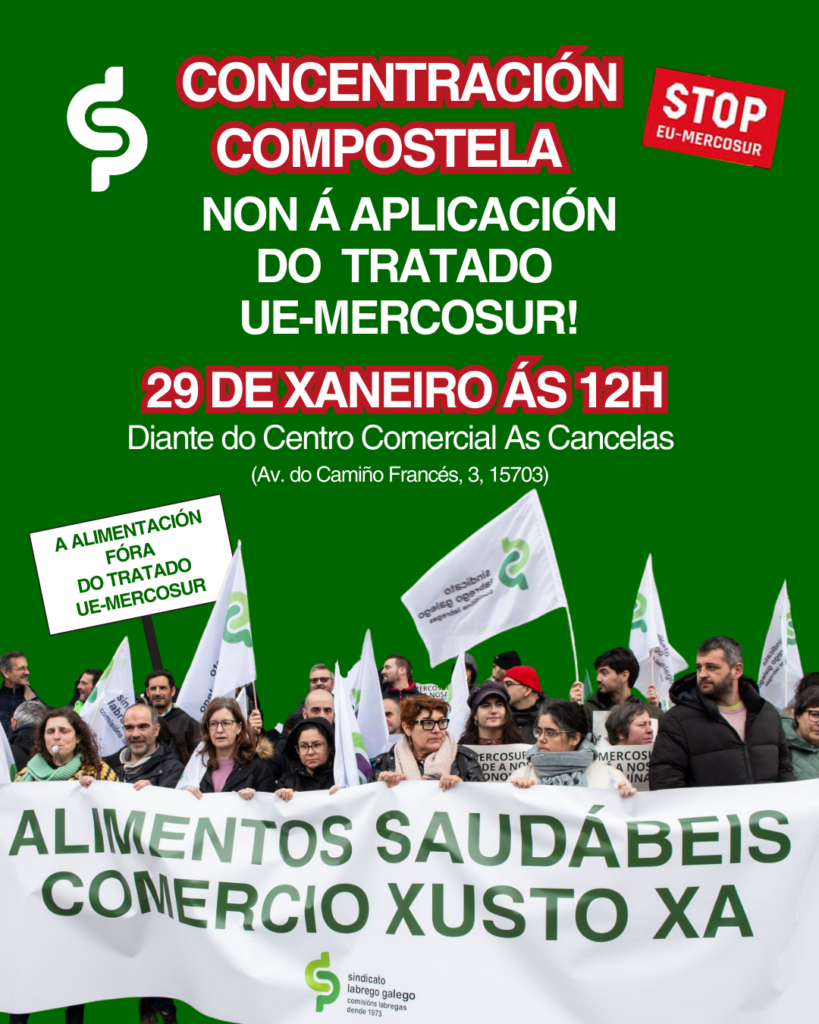 O Sindicato Labrego Galego-Comisións Labregas (SLG-CCLL) convoca unha concentración este xoves, 29 de xaneiro, ás 12:00 horas, diante do Centro Comercial As Cancelas, en Santiago de Compostela (Av. do Camiño Francés, 3). Baixo o lema ‘Non á aplicación do tratado UE-Mercosur’, as labregas e labregos do sindicato buscan exixir que a alimentación quede excluída deste acordo comercial entre a Unión Europea e os países do Mercosur (principalmente Brasil, Arxentina, Paraguai e Uruguai).